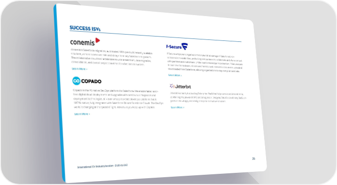 SUCCESS ISVs conemis is Salesforce migration, automated. With pre-built instantly available F-Secure empowers organizations to take full advantage of Salesforce’s rich solutions, conemis removes risks and delays from any Salesforce migrations. collaboration capabilities, protecting companies who collaborate and share content The collaborative cloud tool accelerates source assessment, data migration, with partners and customers. Unlike traditional endpoint protection, F-Secure scans consolidation, and overall project timelines for a fast lane to success. in real-time for malware, viruses and harmful web content in documents uploaded/ downloaded from Salesforce, allowing organizations to stay compliant and safe. Learn More > Learn More > Copado is the #1 native DevOps platform for Salesforce. We enable faster, error- Jitterbit Harmony is a leading Enterprise iPaaS that helps accelerate innovation by free digital cloud deployments and upgrades with continuous integration and combining the power of APIs and integration. Integrate Salesforce with any SaaS, on- deployment technologies, all via an enterprise-class developer platform that is prem or cloud app, and easily compose innovative solutions. 100% native, fully integrated with Salesforce DX and Salesforce Clouds. The DevOps world is changing at the speed of light, make sure you keep up with Copado. Learn More > Learn More > International ISV Industry booklet - EMEA & ANZ 25
