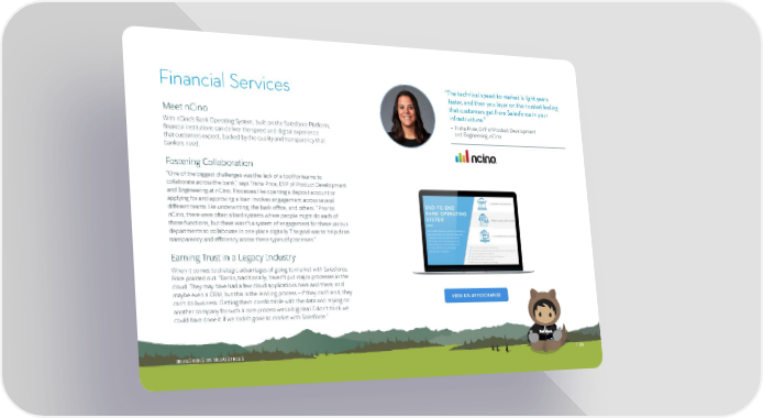 Financial Services “The technical speed-to-market is light years faster, and then you layer on the trusted feeling that customers get from Salesforce in your Meet nCino infrastructure.” — Trisha Price, EVP of Product Development With nCino’s Bank Operating System, built on the Salesforce Platform, and Engineering, nCino financial institutions can deliver the speed and digital experience that customers expect, backed by the quality and transparency that bankers need. Fostering Collaboration “One of the biggest challenges was the lack of a tool for teams to collaborate across the bank,” says Trisha Price, EVP of Product Development and Engineering at nCino. Processes like opening a deposit account or applying for and approving a loan involves engagement across several different teams like underwriting, the back office, and others. “Prior to nCino, there were often siloed systems where people might do each of those functions, but there wasn’t a system of engagement for these various departments to collaborate in one place digitally. The goal was to help drive transparency and efficiency across these types of processes.” Earning Trust in a Legacy Industry When it comes to strategic advantages of going to market with Salesforce, Price pointed out: “Banks, traditionally, haven’t put major processes in the cloud. They may have had a few cloud applications here and there, and maybe even a CRM, but this is the lending process — if they can’t lend, they VIEW ON APPEXCHANGE can’t do business. Getting them comfortable with the data and relying on another company for such a core process was a big deal. I don’t think we could have done it if we hadn’t gone to market with Salesforce.” INVESTING IN INDUSTRIES | 06