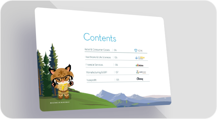 Investing In Industries: How 5 Appexchange Partners Are Seeing Success Page 1 Page 3Contents Retail & Consumer Goods | 04 Healthcare & Life Sciences | 05 Financial Services | 06 Manufacturing & ERP | 07 Nonprofit | 08 INVESTING IN INDUSTRIES | 02