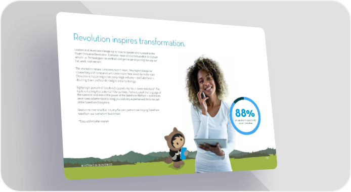 Revolution inspires transformation. Leaders at all levels are strategizing on how to operate and succeed in the Fourth Industrial Revolution. A smarter, more connected world is being built around us. Technologies like artificial intelligence are impacting the way we live, work, and interact. This revolution means customers expect more; they expect always-on connectivity and companies who understand their needs from the start. Disruption is happening across every single industry — and Salesforce is doubling-down and transforming its industry strategy. Eighty-eight percent of Salesforce’s opportunity lies in seven industries*. The key to unlocking that potential? Our partners. Partners speak the language of the customer and extend the power of the Salesforce Platform — and there’s never been a better time to bring your industry expertise and become part of the Salesforce Ecosystem. Read on to hear how five industry-focused partners are helping Salesforce transform our customers’ businesses. 88% *Total addressable market. of Salesforce’s opportunity lies in 7 industries. INVESTING IN INDUSTRIES | 03