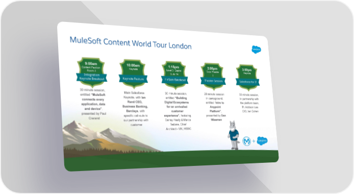 MuleSoft Content World Tour London 9:00am 10:00am 1:15pm 2:00pm 3:00pm Content Pavilion: Keynote Level 3: Capital Expo Theatre Keynote Room 3 Suite 14 2 Integration FinServ Breakout Theater Session Salesforce for IT Keynote Feature Keynote Breakout 30 minute session, Main Salesforce 30 minute session, 20 minute session 30 minute session, entitled “MuleSoft Keynote, with Ian entitled “Building in campground, in partnership with connects every Rand CEO, Digital Ecosystems entitled “Intro to the platform team, application, data Business Banking, for an unrivalled Anypoint Ft. Addison Lee and device”, Barclays, with customer Platform”, CIO, Ian Cohen presented by Paul specific call-outs to experience”, featuring presented by Dan Crerand our partnership with Danny Healy & Marco Wiseman customer Tedone, Chief Architect - UK, HSBC