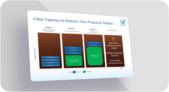 A New Trajectory for Partners: From Projects to Platform PROJECT 1 PROJECT 2 PROJECT 3 FUTURE PROJECT Digital Transformation Acceleration of Customer Experience Refresh Multiple Brands Procurement Approvals Customer Complaints API End-users’ Contact Center API experience drives Omnichannel API assets Mobile API Customer Order API Results organically Reuse assets from achieved previous project Order History API Level of re-use Process Order API Reuse assets from previous project Each project Product API compounds value Customer API TIME Key: Net new asset Reusable asset