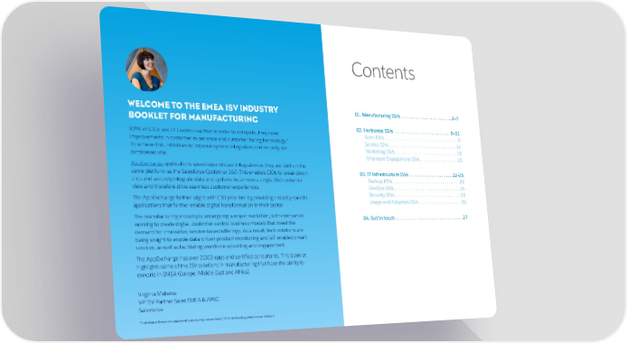 Contents WELCOME TO THE EMEA ISV INDUSTRY 01. Manufacturing ISVs . . . . . . . . . . . . . . . . . . . . . . . . .3–7 BOOKLET FOR MANUFACTURING 02. Horizontal ISVs . . . . . . . . . . . . . . . . . . . . . . . . . . . 8–21 93% of CIOs and IT Leaders say that in order to compete, they need Sales ISVs . . . . . . . . . . . . . . . . . . . . . . . . . . . . . . . . . . . .9 improvements in customer experience and customer facing technology.* Service ISVs . . . . . . . . . . . . . . . . . . . . . . . . . . . . . . . . 14 To achieve this, initiatives to improve system integration and security are Marketing ISVs . . . . . . . . . . . . . . . . . . . . . . . . . . . . . 18 considered vital. Employee Engagement ISVs . . . . . . . . . . . . . . . . . . 20 AppExchange applications speed up and ease integration as they are built on the same platform as the Salesforce Customer 360. This enables CIOs to break down 03. IT Infrastructure ISVs . . . . . . . . . . . . . . . . . . . . . 22–26 silos and securely integrate data and systems to achieve a single 360 customer Backup ISVs . . . . . . . . . . . . . . . . . . . . . . . . . . . . . . . . 23 view and therefore drive seamless customer experiences. DevOps ISVs . . . . . . . . . . . . . . . . . . . . . . . . . . . . . . . . 24 The AppExchange further aligns with CIO priorities by providing industry-specific Security ISVs . . . . . . . . . . . . . . . . . . . . . . . . . . . . . . . 25 applications that further enable digital transformation in their sector. Usage and Adoption ISVs . . . . . . . . . . . . . . . . . . . . 26 The manufacturing industry is undergoing a major revolution, with companies 04. Get in touch . . . . . . . . . . . . . . . . . . . . . . . . . . . . . . . . 27 working to create digital, customer-centric business models that meet the demand for innovative, service-based offerings. As a result, tech solutions are being sought to enable data-driven product monitoring and IoT-enabled smart services, as well as facilitating workforce upskilling and engagement. The AppExchange has over 7,000 apps and certified consultants. This booklet highlights some of the ISV solutions in manufacturing that have the ability to execute in EMEA (Europe, Middle East and Africa). Virginia Matassa VP ISV Partner Sales EMEA & APAC Salesforce *Salesforce Research analysed survey responses from 100+ technology leaders worldwide