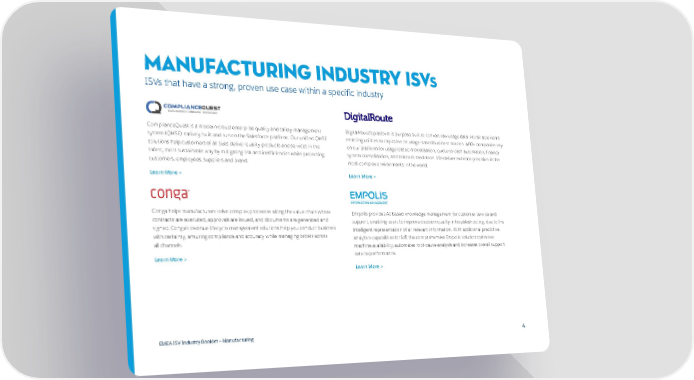 Manufacturing INDUSTRY ISVs ISVs that have a strong, proven use case within a specific industry ComplianceQuest is a modern-cloud enterprise quality and safety management DigitalRoute’s platform is purpose built to convert raw usage data into billable items system (QHSE) natively built and run on the Salesforce platform. Our unified QHSE enabling utilities to capitalise on usage-based business models. 400+ companies rely solutions help customers of all sizes deliver quality products and services in the on our platform for usage-based monetisation, quote-to-cash automation, finance safest, most sustainable way by mitigating risk and inefficiencies while protecting system consolidation, and telecom mediation. We deliver extreme precision in the customers, employees, suppliers and brand. most complex environments in the world. Learn More > Learn More > Conga helps manufacturers solve complex processes along the value chain where Empolis provides AI-based knowledge management for customer service and contracts are executed, approvals are issued, and documents are generated and support, enabling users to improve decision quality in troubleshooting, due to the signed. Conga’s revenue lifecycle management solutions help you conduct business intelligent representation of all relevant information. With additional predictive with certainty, ensuring compliance and accuracy while managing orders across analytics capabilities for IoT, the comprehensive Empolis solution optimises all channels. machine availability, automates root-cause-analysis and increases overall support Learn More > service performance. Learn More > EMEA ISV Industry Booklet — Manufacturing 4