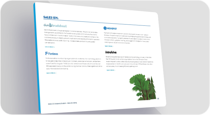 Sales ISVs Dun & Bradstreet is the global leader in commercial data. We provide native data Highspot is the sales enablement platform that Salesforce users trust. Highspot management capabilities to the Salesforce ecosystem which ensures that clients increases the performance of sales teams by bridging the gap between strategy and have confidence in the information held on their accounts, leads and contacts. Our consistent execution. Highspot’s patented AI uses Salesforce data to recommend solutions are easy to deploy, prevent duplication and keep key information updated. the best content, guidance, training, and engagement intelligence in every deal – We enable more accurate reporting, increased sales productivity and greater enabling every rep at the moment of action. user adoption. Learn More > Learn More > Recently recognised as a top 10 fastest growing technology company in Deloitte’s Fonteva enables membership organisations to modernise their technology platform Fast 50 Awards, Introhive helps organisations realise the full value of their to navigate today’s fast-changing environment, better serve members, and achieve relationships and under-utilised data. By ensuring adoption at all levels of Salesforce current and future goals. Fonteva is a full enterprise software solution used by over implementation, Introhive ensures users fully embrace CRM and keeps data clean 300 associations around the world to bring member communities together and drive and accurate, thus increasing ROI and pipeline growth. data-informed decision making. Learn More > Learn More > EMEA ISV Industry Booklet — Manufacturing 1010