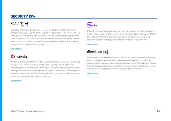 security ISVs WithSecure™ empowers organisations to take full advantage of Salesforce’s rich InCountry provides Salesforce customers with the tools and controls necessary to collaboration capabilities. We do this by protecting companies who collaborate and expand into new regions and countries requiring greater data residency compliance. share content with partners and customers. Unlike traditional endpoint protection Store and process Salesforce data in more countries like China, while staying products, our solution scans in real-time for malware, computer viruses and harmful compliant based on data regulations and your company’s requirements. web content in documents uploaded or downloaded from Salesforce. This allows organisations to stay compliant and safe. Learn More > Learn More > Built natively on the Salesforce platform, OwnBackup Secure delivers data security Trusted by over 8,500 facilities in highly-regulated industries, Imprivata FairWarning insights to guide data classification, compliance requirements, encryption, and delivers the standard for visibility into Salesforce user activity. With Imprivata evidence-based reporting to give leaders confidence in their SaaS data. OwnBackup FairWarning Cloud Solutions, you can interpret user behaviours in real-time, speed Secure helps your organisation strengthen security by understanding data exposure investigations with workflow automation and predict risk with artificial intelligence. risks and proactively taking action to protect your Salesforce data. Visualise insider threats with FairWarning to foster a culture of compliance and trust Learn More > across your employees, partners and customers. Learn More > EMEA ISV Industry Booklet — Manufacturing 25