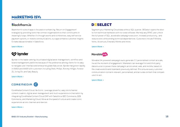 Marketing ISVS Blackthorn’s suite of apps is focused on enhancing ‘Return on Engagement’ Segment your Marketing Cloud data without SQL queries. DESelect opens the door strategies by providing tools that connect organisations to their constituents in to non-technical marketers with no-code software. We help any SFMC user unlock meaningful ways. Whether it’s through events and conferences, easy self-service the full power of SQL, accelerate campaign execution, increase productivity, and payment options, or mobile communications, our apps enhance customer insights reduce costs while ending technical dependencies. Customers include T-Mobile, & make data actionable in Salesforce. Volvo, Accenture, Emerald, Merkle and more. Learn More > Learn More > Bynder is the leader among cloud-based digital asset management, workflow and Movable Ink powered campaigns auto-generate 1:1 personalised content at scale, brand management platforms because of the preference among clients for its easy- live at the moment of engagement. Marketers can leverage first and third-party to-navigate user interface and enterprise-grade feature set. Bynder has grown rapidly data sources to power these campaigns across email, web, and mobile, based on in EMEA and AMER with customers including Shell, Philips, Tommy Hilfiger, Forever the creative and brand standards previously defined. This ensures every customer 21, Irving Oil, and Sally Beauty. communication contains relevant, personalised, and accurate content that compels Learn More > users to act. Learn More > CoreMedia Content Cloud. Be Iconic. Leverage powerful, easy omnichannel content creation, digital asset management and multi-experience orchestration by integrating CoreMedia Content Cloud DXP with Salesforce B2C Commerce, B2B Commerce, and Marketing Cloud. Move at the speed of culture and create iconic experiences across channels and devices. Learn More > EMEA ISV Industry Booklet — Manufacturing 18