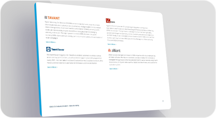 Tavant Warranty On-Demand (TWOD) connects manufacturers, suppliers, service Vigience Overcast provides 50+ prepackaged integrations with Systems, channel partners, and customers on one cohesive, intelligent platform. Automated Applications, and Products in Data Processing (SAP) Enterprise Resource Planning claims management, return merchandise authorisations (RMAs), warranty audits, (ERP) “as-a-service”. The synchronous and asynchronous interfaces span data, recalls, and service analytics provide a differentiating approach to managing process and UI layers to seamlessly connect business processes across Salesforce warranty and service. The app is proven to enable 50% increase in supplier and SAP. Ready-to-use, extendable solution bundles exist for SAP-connected Field recovery, 85% claims auto-processing, parts return optimisation, and automation of Service Lightning, Customer-360, Quote & Order Management, Manufacturing recall campaigns. Cloud and B2B commerce. Learn More > Learn More > The TeamViewer integration for Salesforce enables customers to embed remote Zilliant powers intelligent commerce for B2B companies with cloud-native pricing access and support functions, as well as remote support powered by augmented and sales software. We help our customers use data to deploy their commercial reality (AR), into their Salesforce Sales Cloud and Service Cloud environments. This strategies intelligently and effectively execute in go-to-market channels using AI and helps customers resolve issues faster and increase customer satisfaction. data science, pricing and sales expertise, highly scalable software, and a passion for customer success. Learn More > Learn More > EMEA ISV Industry Booklet — Manufacturing 7