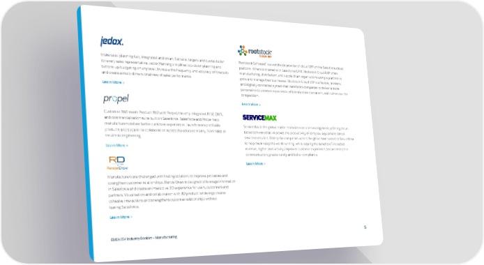 Make sales planning fast, integrated and smart. Set sales targets and quotas faster Rootstock Software® is a worldwide provider of cloud ERP on the Salesforce cloud for every sales representative. Jedox Planning simplifies top-down planning and platform. When combined with Salesforce CRM, Rootstock Cloud ERP offers bottom-up budgeting on any level. Increase the frequency and accuracy of forecasts manufacturing, distribution, and supply chain organisations a single platform to and create a multi-dimensional view of sales performance. grow and manage their businesses. Rootstock Cloud ERP is a flexible, modern, and digitally-connected system that transforms companies to deliver a more Learn More > personalised customer experience, efficiently scale operations, and out-service the competition. Learn More > Customer 360 meets Product 360 with Propel, the only integrated PLM, QMS, and commercialisation suite built on Salesforce. Salesforce and Propel help manufacturers deliver better customer experiences, launch more profitable ServiceMax is the global leader in service execution management, offering cloud- products and streamline collaboration across the entire company, from sales to based software that improves the productivity of complex, equipment-centric service to engineering. service execution. Enterprise companies across the globe have turned to ServiceMax Learn More > to help them keep the world running, while reaping the benefits of increased revenue, higher productivity, improved customer experience, secure enterprise communication, greater safety and better compliance. Learn More > Manufacturers are challenged with finding solutions to improve processes and strengthen customer relationships. RenderDraw is designed to leverage information in Salesforce and create an interactive 3D experience for users, customers and partners. Visualisation and collaboration with 3D product renderings creates cohesive interactions and strengthens customer relationships without leaving Salesforce. Learn More > EMEA ISV Industry Booklet — Manufacturing 5