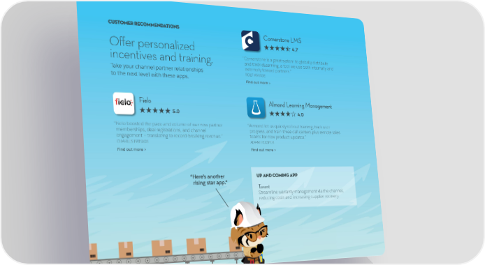 CUSTOMER RECOMMENDATIONS Cornerstone LMS Offer personalized 4.7 incentives and training. “ Cornerstone is a great system to globally distribute and track eLearning, a tool we use both internally and Take your channel partner relationships externally toward partners.” to the next level with these apps. ROLF WAAGE Find out more > Fielo Almond Learning Management 5.0 4.0 “ Fielo boosted the pace and volume of our new partner “ Almond let us quickly roll out training, track user memberships, deal registrations, and channel progress, and train three call centers plus remote sales engagement — translating to record-breaking revenue.” teams for new product updates.” CHARLES PATSIOS ADAM HOOPER Find out more > Find out more > “ Here’s another UP AND COMING APP rising star app.” Tavant Streamline warranty management via the channel, reducing costs and increasing supplier recovery.