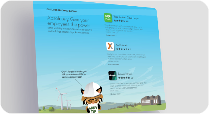 CUSTOMER RECOMMENDATIONS Sage Business Cloud People Absolutely. Give your 4.8 employees the power. “ Sage Business Cloud People helps gain insight as to how employees work, how competent they are, and More visibility into compensation structures allows time to approach any situation.” and trainings creates happier employees. THERESE KERFOOT Find out more > Xactly Incent 4.7 “ Xactly Incent streamlined our process, eliminating a week-long task to calculate credits, commissions, and to distribute statements to sales.” RIMSHA HASSAN Find out more > “ Don’t forget to make your HR system accessible to Simpplr Intranet remote employees.” 4.9 “ Simpplr users find new ways to communicate, share ideas, and find information. Within 2 weeks of launch we had a 90% adoption rate.” STEVE WYLIE Find out more >