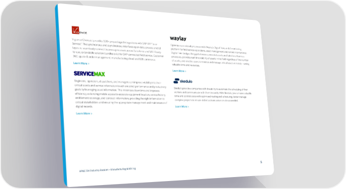 Vigience Overcast provides 100+ prepackaged integrations with SAP ERP “as-a- Optimize operational processes with Waylay’s Digital Twin, an IoT monitoring Service”. The synchronous and asynchronous interfaces span data, process and UI platform for field service operations, asset management and remote maintenance. layers to seamlessly connect business processes across Salesforce and SAP. Ready- Digital Twin bridges the gap between connected assets and Salesforce business to-use, extendable solution bundles exist for SAP-connected field service, Customer processes, provides real-time visibility of assets in the field regardless of the number 360, quote & order management, manufacturing cloud and B2B commerce. of assets, and enables users to monitor and manage critical assets remotely — saving valuable time and resources. Learn More > Learn More > Engineers, operators, dispatchers, and managers can improve visibility into their critical assets and service information to achieve strict performance and productivity Skedulo provides companies with the ability to automate the scheduling of their goals by leveraging asset information. This minimizes downtime and improves workers and communicate with them instantly. With Skedulo, you can save valuable efficiency, extending mobile access to accurate equipment location, service history, time and control costs with optimized routing and scheduling. Better manage entitlement coverage, and contract information, providing the right information to complex projects to ensure skilled workers arrive on-site as needed. critical stakeholders and ensuring the appropriate management and maintenance of digital records. Learn More > Learn More > APAC ISV Industry Booklet — Manufacturing & Mining 5