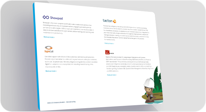 Showpad is the most complete and flexible sales enablement platform that Powered by configure, price and quote (CPQ), Tacton Smart Commerce enables marketing and sales rely on to prepare sellers, engage buyers and optimise manufacturers to do business in a smarter way. Our solutions include Tacton CPQ performance with insights. With a single user experience, our solution makes it for streamlined processes, visualisation for an immersive experience, integrations to easy to discover and share the right content, deliver training and coaching, and your most vital tools, design automation for engineer empowerment, analytics for maximise seller productivity. intelligent decision making, and omnichannel sales that enable customers to shop the channels they desire. Gartner named Tacton the ‘go-to’ CPQ solution Find out more > for manufacturers. Find out more > Live video support with AR and AI for customers, technicians, and providers. Vigience Overcast provides 50+ prepackaged integrations with Systems, Escalate any conversation to a video call, so your team sees what your customer, Applications, and Products in Data Processing (SAP) Enterprise Resource Planning technician, or patient sees. Remotely diagnose and guide fast problem resolution. (ERP) “as-a-service”. The synchronous and asynchronous interfaces span data, SightCall customers cross many industries including manufacturing, telco, process and UI layers to seamlessly connect business processes across Salesforce insurance and utilities. and SAP. Ready-to-use, extendable solution bundles exist for SAP-connected Field Service Lightning, Customer-360, Quote & Order Management, Manufacturing Cloud Find out more > and B2B commerce. Find out more > EMEA ISV Industry Booklet – Manufacturing