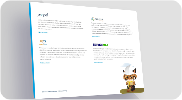 Customer 360 meets Product 360 with Propel, the only integrated PLM, QMS, Rootstock Software® is a worldwide provider of cloud ERP on the Salesforce cloud and Commercialisation suite built on Salesforce. Salesforce and Propel help platform. When combined with Salesforce CRM, Rootstock Cloud ERP offers manufacturers deliver better customer experiences, launch more profitable manufacturing, distribution, and supply chain organisations a single platform to products and streamline collaboration across the entire company, from sales to grow and manage their businesses. Rootstock Cloud ERP is a flexible, modern, and service to engineering. digitally-connected system that transforms companies to deliver a more personalised customer experience, efficiently scale operations, and out-service the competition. Find out more > Find out more > Manufacturers are challenged with finding solutions to improve processes and ServiceMax is the global leader in service execution management, offering cloud- strengthen customer relationships. RenderDraw is designed to leverage information based software that improves the productivity of complex, equipment-centric service in Salesforce and create an interactive 3D experience for users, customers and execution. Enterprise companies across the globe have turned to ServiceMax to help partners. Visualisation and collaboration with 3D product renderings creates them keep the world running, while reaping the benefits of increased revenue, higher cohesive interactions and strengthens customer relationships without productivity, improved customer experience, secure enterprise communication, leaving Salesforce. greater safety and better compliance. Find out more > Find out more > EMEA ISV Industry Booklet – Manufacturing