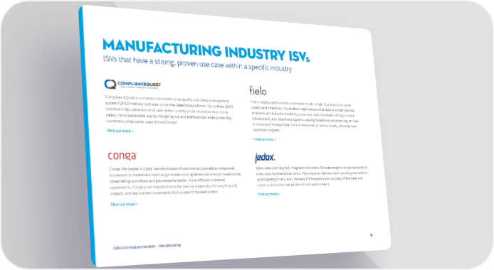 Manufacturing Industry ISVs ISVs that have a strong, proven use case within a specific industry ComplianceQuest is a modern-cloud enterprise quality and safety management Fielo is loyalty and incentive automation made simple. Our Salesforce-native system (QHSE) natively built and run on the Salesforce platform. Our unified QHSE Loyalty and Incentives Clouds allow organisations of all sizes to modernise their solutions help customers of all sizes deliver quality products and services in the programs and bring the flexibility, power and cost advantages of digital to their safest, most sustainable way by mitigating risk and inefficiencies while protecting critical loyalty and incentive programs. Leading Salesforce customers rely on Fielo customers, employees, suppliers and brand. to create and manage their channel incentives, customer loyalty, and employee Find out more > incentives program. Find out more > Conga, the leader in digital transformation of commercial operations, empowers Make sales planning fast, integrated and smart. Set sales targets and quotas faster for businesses to modernise revenue generation and optimise commercial relationships, every sales representative. Jedox Planning simplifies top-down planning and bottom- streamlining workflows and processes for better, more efficient customer up budgeting on any level. Increase the frequency and accuracy of forecasts and experiences. Conga gives manufacturers the tools to modernise the way they sell, create a multi-dimensional view of sales performance. interact, and service their customers, from quotes to booked orders. Find out more > Find out more > EMEA ISV Industry Booklet – Manufacturing 44