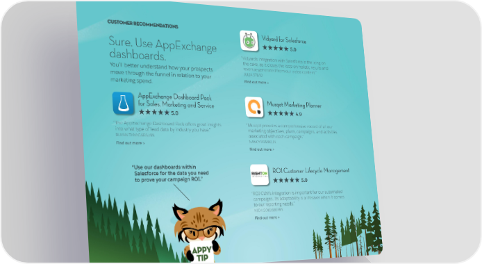 CUSTOMER RECOMMENDATIONS Vidyard for Salesforce Sure. Use AppExchange 5.0 dashboards. “ Vidyard’s integration with Salesforce is the icing on the cake, as it closes the loop on holistic results and You’ll better understand how your prospects revenue generated from our video content.” move through the funnel in relation to your JULIA STEAD marketing spend. Find out more > AppExchange Dashboard Pack Musqot Marketing Planner for Sales, Marketing and Service 5.0 4.9 “ The AppExchange Dashboard Pack offers great insights “ Musqot provides a comprehensive record of all our into what type of lead data by industry you have.” marketing objectives, plans, campaigns, and activities BUYAN THYAGARAJAN associated with each campaign.” Find out more > NANCY FRANKLIN Find out more > “ Use our dashboards within ROI Customer Lifecycle Management Salesforce for the data you need toproveyourcampaignROI.” 5.0 “ ROI CLM’s integration is important for our automated campaigns. Its adaptability is a lifesaver when it comes to our reporting needs.” NICK GOLDSBERRY. Find out more >