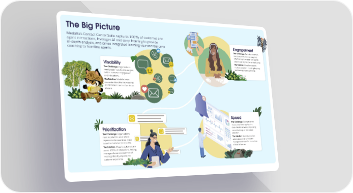 The Big Picture Medallia’s Contact Center Suite captures 100% of customer and agent interactions, leverages AI and deep learning to provide Engagement in-depth analysis, and drives integrated learning via near real-time coaching to frontline agents. The Challenge: Patients, members, and consumers need an easy and effective way to engage with agents beyond calling into the contact center. The Solution: Medallia supports Visability multiple channels including two-way The Challenge: Organizations text messaging and web chat. need greater visibility into insights behind customer engagement and interactions. The Solution: Medallia helps you understand the truth behind all interactions and surface issues at scale. Speed The Challenge: Contact center needs a real-time way to alert Prioritization cross-functional teams of pressing issues that require immediate The Challenge: Organizations attention. need to prioritize areas where The Solution: Medallia provides improvements need to be made automated alerts to the case based on customer pain points. management team for immediate The Solution: Medallia automatically clinical follow-up. scores 100% of interactions, helping managers focus on areas that will most significantly improve the customer experience.