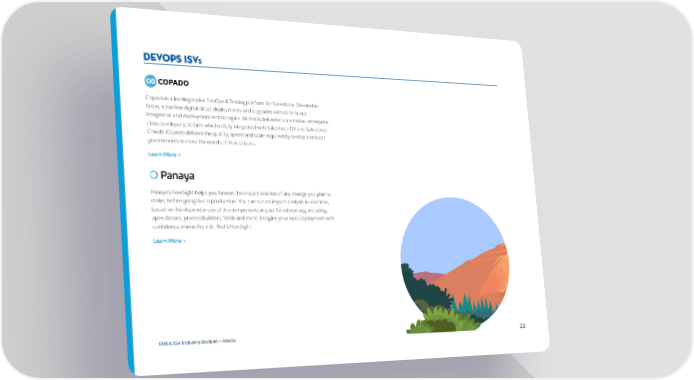 devops ISVs Copado is a leading native DevOps & Testing platform for Salesforce. We enable faster, error-free digital cloud deployments and upgrades with continuous integration and deployment technologies. All this is delivered via a native, enterprise- class developer platform which is fully integrated with Salesforce DX and Salesforce Clouds. Copado delivers the quality, speed and scale required by central and local governments to meet the needs of their citizens. Learn More > Panaya’s ForeSight helps you foresee the impact and risk of any change you plan to make, before going live in production. You can run an impact analysis in real time, based on the dependencies of the components in your Salesforce org, including: apex classes, process builders, fields and more. Imagine your next deployment with confidence, minus the risk. That’s ForeSight. Learn More > EMEA ISV Industry Booklet — Media 22