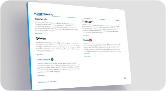 Marketing ISVS Blackthorn’s suite of apps is focused on enhancing ‘Return on Engagement’ Segment your Marketing Cloud data without SQL queries. DESelect opens the door strategies by providing tools that connect organisations to their constituents in to non-technical marketers with no-code software. We help any SFMC user unlock meaningful ways. Whether it’s through events and conferences, easy self-service the full power of SQL, accelerate campaign execution, increase productivity, and payment options, or mobile communications, our apps enhance customer insights reduce costs while ending technical dependencies. Customers include T-Mobile, & make data actionable in Salesforce. Volvo, Accenture, Emerald, Merkle and more. Learn More > Learn More > Bynder is the leader among cloud-based digital asset management, workflow and Movable Ink powered campaigns auto-generate 1:1 personalised content at scale, brand management platforms because of the preference among clients for its easy- live at the moment of engagement. Marketers can leverage first and third-party to-navigate user interface and enterprise-grade feature set. Bynder has grown rapidly data sources to power these campaigns across email, web, and mobile, based on in EMEA and AMER with customers including Shell, Philips, Tommy Hilfiger, Forever the creative and brand standards previously defined. This ensures every customer 21, Irving Oil, and Sally Beauty. communication contains relevant, personalised, and accurate content that compels Learn More > users to act. Learn More > CoreMedia Content Cloud. Be Iconic. Leverage powerful, easy omnichannel content creation, digital asset management and multi-experience orchestration by integrating CoreMedia Content Cloud DXP with Salesforce B2C Commerce, B2B Commerce, and Marketing Cloud. Move at the speed of culture and create iconic experiences across channels and devices. Learn More > EMEA ISV Industry Booklet — Media 16
