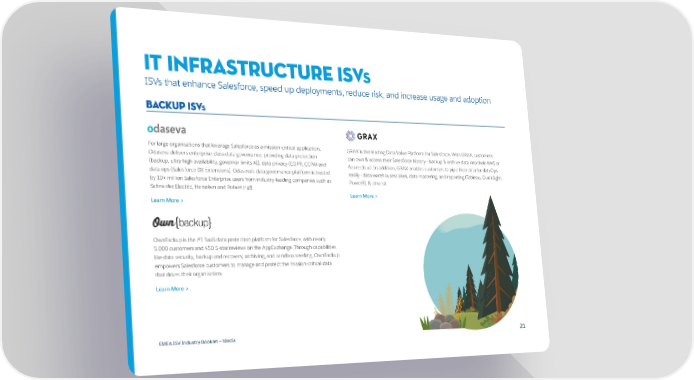 IT INFRASTRUCTURE ISVs ISVs that enhance Salesforce, speed up deployments, reduce risk, and increase usage and adoption backup ISVs For large organisations that leverage Salesforce as a mission-critical application, GRAX is the leading Data Value Platform for Salesforce. With GRAX, customers Odaseva delivers enterprise-class data governance, providing data protection can own & access their Salesforce history - backup & archive data into their AWS or (backup, ultra-high availability, governor limits AI), data privacy (GDPR, CCPA) and Azure cloud. In addition, GRAX enables customers to pipe their data for dataOps data ops (Salesforce DX Extensions). Odaseva’s data governance platform is trusted easily - data warehouses/lakes, data mastering, and reporting (Tableau, QuickSight, by 10+ million Salesforce Enterprise users from industry-leading companies such as PowerBI, & others). Schneider Electric, Heineken and Robert Half. Learn More > Learn More > OwnBackup is the #1 SaaS data protection platform for Salesforce, with nearly 5,000 customers and 450 5-star reviews on the AppExchange. Through capabilities like data security, backup and recovery, archiving, and sandbox seeding, OwnBackup empowers Salesforce customers to manage and protect the mission-critical data that drives their organisation. Learn More > EMEA ISV Industry Booklet — Media 2121