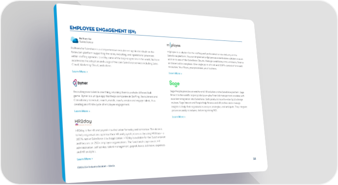 employee engagement ISVS Bullhorn for Salesforce is a comprehensive recruitment application built on the m|ployee is a solution for the staffing and professional service industry on the force.com platform supporting the sales, recruiting, and operational processes Salesforce platform. You can implement m|ployee as a stand-alone solution or as an within staffing agencies. Used by some of the largest agencies in the world, Bullhorn add-on to one of the Salesforce Clouds. Manage candidates, time, contracts, finance accelerates the adoption and usage of the core Salesforce services including Sales and talent all in one place. One single point of truth and 100% control of time and Cloud, Marketing Cloud, and others. resources. Your flows, your processes, your business. Learn More > Learn More > Recruiting new talent is one thing, retaining them is a whole different ball Sage People provides an end-to-end HR solution on the Salesforce platform. Sage game. Byner is a unique app that helps companies in Staffing, Recruitment and Intacct is the world’s largest global pure-play financial management provider, with Consultancy to recruit, search, match, coach, service and engage talent, thus excellent integration into Salesforce. Both products have five-star AppExchange creating an infinite cycle of employee engagement. reviews. Sage Intacct and People help finance and HR professionals manage insights to help their organisations analyse, strategise, and anticipate. They integrate Learn More > processes and procedures, delivering strong ROI. Learn More > HR2day is the HR and payroll cloud solution for today and tomorrow. The vision is to help organisations optimise their HR and payroll processes by using HR2days — a 100% native Salesforce cloud application. HR2day is available for the Dutch market and focuses on 250+ employee organisations. The functional scope covers HR administration, self service, talent management, payroll, leave, sick leave, expenses and HR analytics. Learn More > EMEA ISV Industry Booklet — Media 18