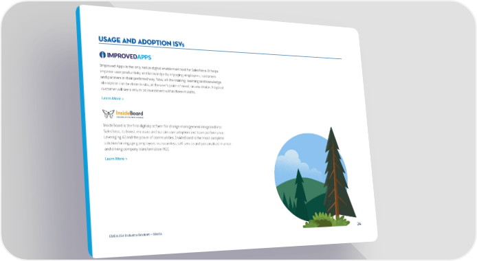 usage and adoption ISVs Improved Apps is the only native digital enablement tool for Salesforce. It helps improve user productivity and knowledge by engaging employees, customers and partners in their preferred way. Now, all the training, learning and knowledge absorption can be done in-situ, at the user’s point of need, on any device. A typical customer will see a return on investment within three months. Learn More > InsideBoard is the first digital platform for change management integrated into Salesforce, to boost, measure and sustain user adoption and team performance. Leveraging AI and the power of communities, InsideBoard is the most complete solution for engaging employees in a seamless, self-service and personalised manner and driving company transformation ROI. Learn More > EMEA ISV Industry Booklet — Media 24