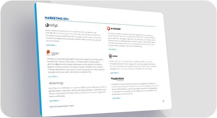 Marketing ISVS optilyz enables companies to run more customer-centric, sustainable, and The Sitecore and Salesforce partnership brings together Sitecore’s leadership in profitable direct mail campaigns. The tool is easily activated within the Salesforce content and digital experience management and Salesforce’s leading capabilities in Marketing Cloud and used by hundreds of companies across Europe. It empowers segmentation and campaign management. The partnership is centred around two marketers to integrate letters, postcards, and self-mailers into their cross-channel important tenets of unified data and faster time to market. The by-product results customer journeys. in the ability to truly personalise, optimise, and speak to customers at a 1:1 level through content, campaigns, and customer relationships. Learn More > Learn More > Phrasee is an AI-powered SaaS platform that revolutionises customer experiences through Brand Language Optimisation. The Phrasee platform brings together Vudoo enables you to create interactive experiences within video content. artificial intelligence and computational linguistics, as the only tool of its kind, to Personalised interactions drive engagement, uncovering insights that enhance generate, optimise, automate, and analyse language in real-time. Joint customers the use of Marketing Cloud, and generate business outcomes. Use cases include of Phrasee and Salesforce can deploy on-brand language at scale, driving significant shoppable video, commerce, ‘choose your own adventure’ and training. campaign performance uplift, with minimal operational effort. Learn More > Learn More > Wunderkind, formerly BounceX, is an expert at helping eComm leaders win SalesWings is the “B2B Studio” for Salesforce Marketing Cloud, helping companies to customers by creating true 1:1 experiences for currently anonymous traffic across generate leads for sales teams. Flexible lead website tracking, no-code lead scoring devices. With Salesforce, customers are scaling list growth +4-6x through best- and sales reporting for Sales Cloud, all ensure that the best leads are engaged with in-class email capture strategy, and matching site visitors to CRM, increasing timely and effectively. abandonment email revenue +6x. Learn More > Learn More > EMEA ISV Industry Booklet — Media 17