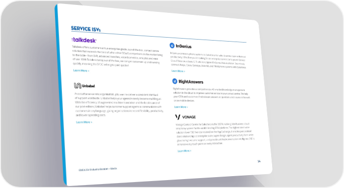 service ISVS Talkdesk offers customers a true enterprise-grade, out-of-the-box, contact centre InGenius connects phone systems to Salesforce for sales & service team enhanced solution that exceeds the best of what other CCaaS competitors on the market bring productivity. Whether you’re looking for an enterprise connector to power Service to the table - from IVR, advanced transfers, voice biometrics, analytics and ease Cloud Voice or a classic CTI solution, Upland InGenius has a solution. Seamlessly of use. With Talkdesk being out of the box, we can get customers up and running connect Avaya, Cisco, Genesys, Asterisk, and Mitel phone systems with Salesforce. quickly, meaning the SFDC seller gets paid quicker! Learn More > Learn More > RightAnswers provides a comprehensive AI-enabled knowledge management solution in the cloud to improve customer service in your contact centre. We help As a customer-centric organisation, you want to deliver a consistent standard your CSRs and customers find relevant answers to questions and issues on the web of support worldwide. Unbabel helps your agents instantly become multilingual. or on mobile devices. With the efficiency of augmented machine translation and the local nuance of our post-editors, Unbabel helps customer support agents to communicate with Learn More > customers in any language, giving organisations increased flexibility, productivity, and lower operating costs. Learn More > Vonage Contact Centre for Salesforce is the 100% native global business cloud telephony system for the world’s leading CRM platform. The highest rated voice solution (over 730 five-star reviews) on the AppExchange, it enables personalised client relationships at enterprise scale, super-charges agent productivity from white glove to high volume support, and provides artificial conversation intelligence (AI) to enhance every touch point on every interaction. Learn More > EMEA ISV Industry Booklet — Media 14