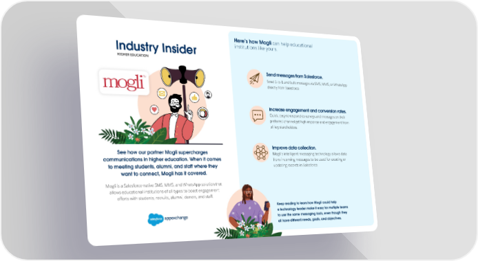 See how our partner Mogli supercharges communications in higher education. When it comes to meeting students, alumni, and staff where they want to connect, Mogli has it covered. Here’s how Mogli can help educational institutions like yours. Mogli is a Salesforce-native SMS, MMS, and WhatsApp solution that allows educational institutions of all types to boost engagement efforts with students, recruits, alumni, donors, and staff. Keep reading to learn how Mogli could help a technology leader make it easy for multiple teams to use the same messaging tools, even though they all have different needs, goals, and objectives. Send messages from Salesforce. Send 1-to-1 and bulk messages via SMS, MMS, or WhatsApp directly from Salesforce. Improve data collection. Mogli’s intelligent messaging technology allows data from incoming messages to be used for creating or updating records in Salesforce. Increase engagement and conversion rates. Quick, easy-to-respond-to surveys and messages on their preferred channel get high response and engagement from all key stakeholders. Industry Insider HIGHER EDUCATION