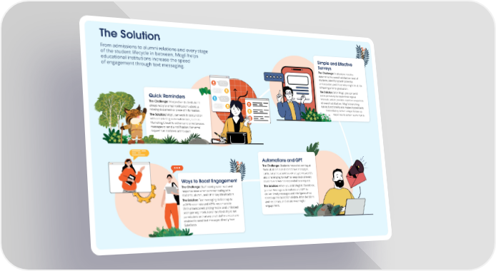 Automations and GPT The Challenge: Students have a lot coming at them at all times and sometimes messages, particularly those sent via email, get missed. It’s also challenging for staff to keep track of every student who has not responded to a request. The Solution: When you add Mogli to Salesforce, you can leverage automations and GPT to deliver timely messages and intelligence that speed up the collection of data, drive decisions and responses, and create meaningful engagement. Quick Reminders The Challenge: Prospective students don’t always reply to email notifications about a missing document or piece of information. The Solution: Mogli, can work in conjunction with a marketing automation tool, such as Marketing Cloud, to either send simultaneous messages or send a notification if an email request has not been acted upon. Ways to Boost Engagement The Challenge: Staff need greater read and response rates when communicating with students, alumni, and other key stakeholders. The Solution: Text messaging delivers up to a 98% open rate and 45% response rate. With a transparent pricing model and unlimited users per org, institutions have flexibility to set permissions so that any or all staff members are enabled to send text messages directly from Salesforce. Simple and Effective Surveys The Challenge: Institutions need to determine the overall satisfaction level of students, identifying both potential ambassadors and those who might be at risk of leaving prior to graduation. The Solution: With Mogli, you can send a simple survey to students at regular intervals, which provides real-time snapshots of overall satisfaction. Mogli’s branching survey functionality also makes it possible to immediately deliver unique follow-up responses to certain score inputs. The Solution From admissions to alumni relations and every stage of the student lifecycle in between, Mogli helps educational institutions increase the speed of engagement through text messaging.