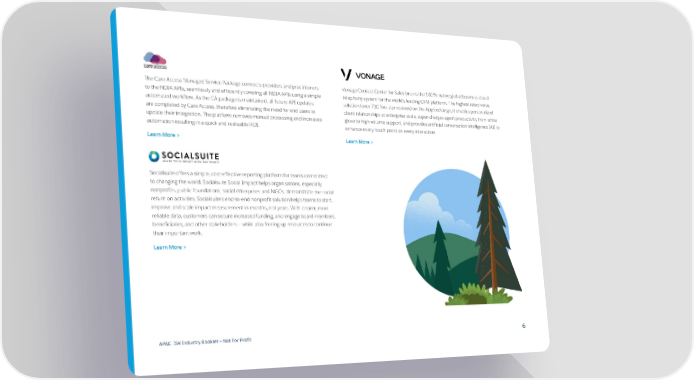 The Care Access Managed Service Package connects providers and practitioners Vonage Contact Center for Salesforce is the 100% native global business cloud to the NDIA APIs, seamlessly and efficiently covering all NDIA APIs using a simple telephony system for the world’s leading CRM platform. The highest rated voice automated workflow. As the CA package is maintained, all future API updates solution (over 730 five-star reviews) on the AppExchange, it enables personalized are completed by Care Access, therefore eliminating the need for end users to client relationships at enterprise scale, super-charges agent productivity from white update their integration. The platform removes manual processing and increases glove to high volume support, and provides artificial conversation intelligence (AI) to automation resulting in a quick and realizable ROI. enhance every touch point on every interaction. Learn More > Learn More > Socialsuite offers a simple, cost-effective reporting platform for teams committed to changing the world. Socialsuite Social Impact helps organisations, especially nonprofits, public foundations, social enterprises and NGOs, demonstrate the social return on activities. Socialsuite’s end-to-end nonprofit solution helps teams to start, improve and scale impact measurement in months, not years. With clearer, more reliable data, customers can secure increased funding, and engage board members, beneficiaries, and other stakeholders – while also freeing up resources to continue their important work. Learn More > APAC ISV Industry Booklet — Not For Profit 6