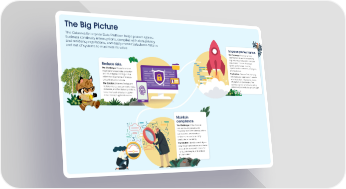 The Big Picture The Odaseva Enterprise Data Platform helps protect against business continuity interruptions, complies with data privacy and residency regulations, and easily moves Salesforce data in Improve performance. and out of systems to maximize its value. The Challenge: Financial services organizations store and transact very large volumes of data within complex data models. This can slow down system performance — hurting Reduce risks. experiences for customers, employees, The Challenge: Financial services and developers. organizations need data protection The Solution: Odaseva Data Archiving and risk mitigation strategies that automates your organization’s rules for reflect the importance of mission- which data stays in Salesforce, moves critical transactional data. off-platform, or gets deleted. This The Solution: Odaseva Backup and optimizes system performance, while Restore ensures you can recover data, still allowing access to the archived data. metadata, and files from any point in time. Five levels of data encryption armor backups against breaches. Maintain compliance. The Challenge: In the financial services industry, penalties for noncompliance with data regulations can be severe, and developer environments can be an easily overlooked vulnerability. The Solution: Take full control of your data lifecycle and resolve compliance issues at the source with consumer rights, data lifecycle, and sandbox anonymization.