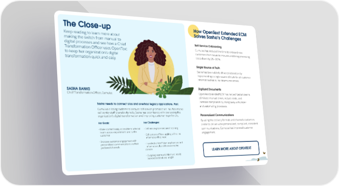 How OpenText Extended ECM The Close-up Solves Sasha’s Challenges Keep reading to learn more about making the switch from manual to Self-Service Onboarding digital processes and see how a Chief Cumulus has reduced the time to onboard new Transformation Officer uses OpenText customers from hours to minutes and bring processing to keep her organization’s digital costs down by 25–30%. transformation quick and easy. Single Source of Truth Sasha has been able to drive collaboration by implementing a single source of truth for all customer information that all her teams can access. SASHA BANKS Digitized Documents Chief Transformation Officer, Cumulus OpenText Extended ECM has helped Sasha’s teams eliminate manual errors, reduce costs, and Sasha needs to connect silos and overhaul legacy applications. Fast. increase compliance by doing away with paper and automating processes. Cumulus is losing customers because self service processes are insufficient and call center staff is unable to help. Sasha has been tasked with overseeing the organization’s digital transformation and improving customer experiences. Personalized Communications Her Goals: Her Challenges: By using the delivery formats and channels customers prefer to deliver ultra-personalized, compliant, consistent - Make content easily accessible to internal - Self service processes aren’t working communications, Cumulus has improved customer teams across departments and to the engagement. customer - Call center staff is struggling to find the information they need - Increase customer engagement with personalized communications via their - Hundreds of inefficient applications and preferred channels information silos with disconnected content LEARN MORE ABOUT OPENTEXT - Outgoing communications are poorly branded and lack real insight