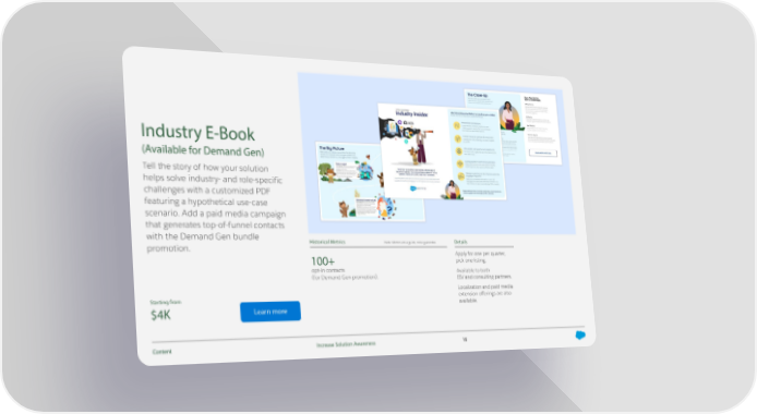 Industry E-Book (Available for Demand Gen) Tell the story of how your solution helps solve industry- and role-specific challenges with a customized PDF featuring a hypothetical use-case scenario. Add a paid media campaign that generates top-of-funnel contacts with the Demand Gen bundle promotion. Historical Metrics Note: Metrics are a guide, not a guarantee. Details Apply for one per quarter, 100+ pick one listing. opt-in contacts Available to both (for Demand Gen promotion). ISV and consulting partners. Localization and paid media Starting from extension o昀昀erings are also $4K Learn more available. Content Increase Solution Awareness 16