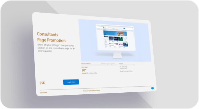 Consultants Page Promotion Show off your listing in the sponsored section on the consultants page for an entire quarter. Historical Metrics Note: Metrics are a guide, not a guarantee. Details Estimated For consulting % partners only. 80 Apply for one per listing. average lift in listing tra昀케c. $5K Learn more Sponsored Promote AppExchange Listing 7
