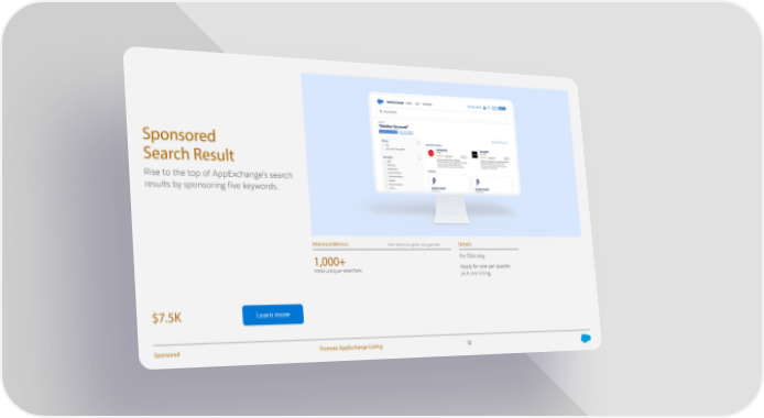Sponsored Search Result Rise to the top of AppExchange’s search results by sponsoring five keywords. Historical Metrics Note: Metrics are a guide, not a guarantee. Details 1,000+ For ISVs only. total unique searches. Apply for one per quarter, pick one listing. $7.5K Learn more Sponsored Promote AppExchange Listing 12
