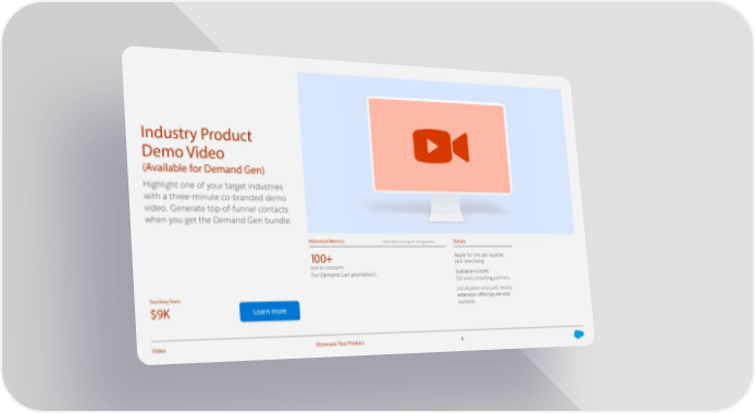 Industry Product Demo Video (Available for Demand Gen) Highlight one of your target industries with a three-minute co-branded demo video. Generate top-of-funnel contacts when you get the Demand Gen bundle. Historical Metrics Note: Metrics are a guide, not a guarantee. Details 100+ Apply for one per quarter, pick one listing. opt-in contacts (for Demand Gen promotion). Available to both ISV and consulting partners. Localization and paid media Starting from extension o昀昀erings are also $9K Learn more available. Video Showcase Your Product 4