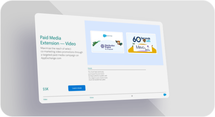 Paid Media Extension — Video Maximize the reach of select co-marketing video promotions through a targeted paid media campaign on AppExchange.com Details You must have previously purchased the promotion during a previous quarter, and the original asset creation date must not exceed two years. $5K Learn more Video Extras 20