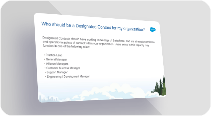 Who should be a Designated Contact for my organization? Designated Contacts should have working knowledge of Salesforce, and are strategic escalation and operational points of contact within your organization. Users setup in this capacity may function in one of the following roles: • Practice Lead • General Manager • Alliance Managers • Customer Success Manager • Support Manager • Engineering / Development Manager