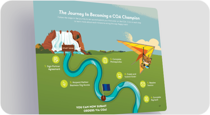 The Journey to Becoming a COA Champion Follow the steps in the journey to set up and submit your first order on the COA. Click on each step to learn more about each milestone along the way. Happy trails! START HERE 3. Complete Prerequisites 1. Sign Partner Agreement 4. Create and Submit Order 2. Request Partner 5. Receive Business Org Access Invoice 6. Complete Payment YOU CAN NOW SUBMIT ORDERS VIA COA! 07