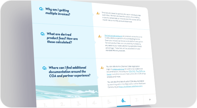 Q: Why am I getting A: Invoices are issued to partners for each individual order multiple invoices? submitted. Partners do have the option of submitting a case to consolidate all invoices over the course of the month into a monthly account statement. Q: What are derived A: Derived priced products are products where the price product fees? How are is calculated as a percent of a contributing license. Examples include sandboxes and platform encryption. these calculated? Derived product fees are calculated by multiplying any sales to your end customer by a predetermined percentage. These fees will be populated on your standard monthly invoices. Q: Where can I find additional A: You can refer to the Channel Order Application documentation around the page at p.force.com/coa for additional enablement documentation, including our COA FAQ. The ISVForce COA and partner experience? Guide is another resource that outlines the COA set up process and more. You can also find lots of useful COA documentation by searching within the Help section of the Trailblazer Community at https://trailblazer.salesforce.com/ 1. 2. 3. 4. 5. 6. 7. 24