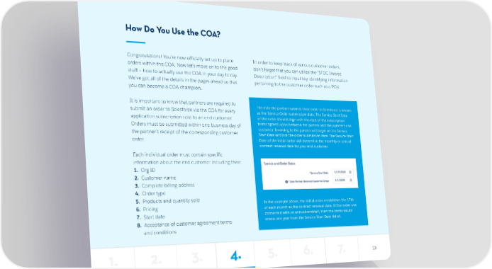 How Do You Use the COA? Congratulations! You’re now officially set up to place In order to keep track of various customer orders, orders within the COA. Now let’s move on to the good don’t forget that you can utilize the “SFDC Invoice stuff — how to actually use the COA in your day to day. Description” field to input key identifying information We’ve got all of the details in the pages ahead so that pertaining to the customer order such as a PO#. you can become a COA champion. It is important to know that partners are required to The date the partner submits their order to Salesforce is known submit an order to Salesforce via the COA for every as the Service Order submission date. The Service Start Date application subscription sold to an end customer. of the order should align with the start of the subscription Orders must be submitted within one business day of terms agreed upon between the partner and the partner’s end the partner’s receipt of the corresponding customer customer. Invoicing to the partner will begin on the Service Start Date and not the order submission date. The Service Start order. Date of the initial order will determine the monthly or annual contract renewal date for your end customer. Each individual order must contain specific information about the end customer including their: 1. Org ID 2. Customer name 3. Complete billing address 4. Order type 5. Products and quantity sold In the example above, the initial order establishes the 17th 6. Pricing of each month as the contract renewal date. If this order was 7. Start date connected with an annual contract, then the terms would 8. Acceptance of customer agreement terms renew one year from the Service Start Date listed. and conditions 1. 2. 3. 4. 5. 6. 7. 13