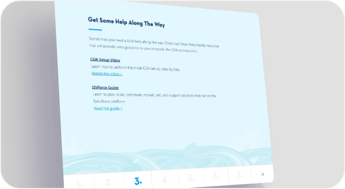Get Some Help Along The Way Sometimes you need a little help along the way. Check out these these handy resources that will provide extra guidance as you complete the COA prerequisites. COA Setup Video Learn how to perform the initial COA set up, step by step. Watch the video > ISVForce Guide Learn to plan, build, distribute, market, sell, and support solutions that run on the Salesforce platform. Read the guide > 1. 2. 3. 4. 5. 6. 7. 11