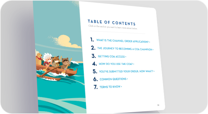 TABLE OF CONTENTS Click on the section you want to learn more about below. WHAT IS THE CHANNEL ORDER APPLICATION? > 1. THE JOURNEY TO BECOMING A COA CHAMPION > 2. GETTING COA ACCESS > 3. HOW DO YOU USE THE COA? > 4. YOU’VE SUBMITTED YOUR ORDER. NOW WHAT? > 5. COMMON QUESTIONS > 6. TERMS TO KNOW > 7. 02