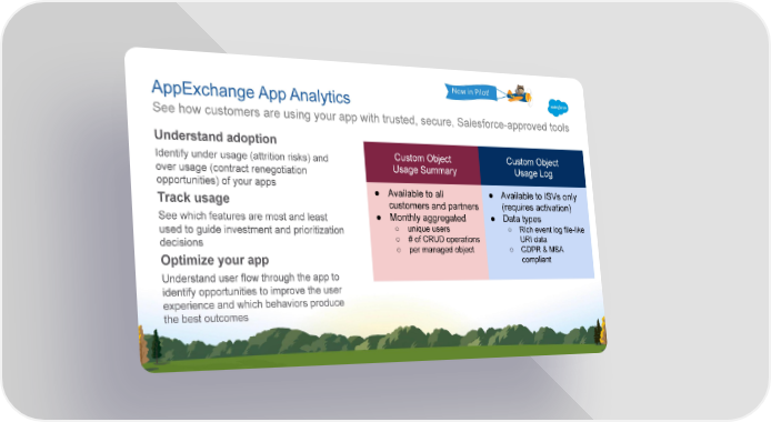 Now in Pilot! AppExchange App Analytics See how customers are using your app with trusted, secure, Salesforce-approved tools Understand adoption Custom Object Custom Object Identify under usage (attrition risks) and Usage Summary Usage Log over usage (contract renegotiation opportunities) of your apps ● Available to all ● Available to ISVs only Track usage customers and partners (requires activation) ● Monthly aggregated ● Data types See which features are most and least ○ unique users ○ Rich event log file-like used to guide investment and prioritization ○ # of CRUD operations URI data decisions ○ per managed object ○ GDPR & MSA Optimize your app compliant Understand user flow through the app to identify opportunities to improve the user experience and which behaviors produce the best outcomes