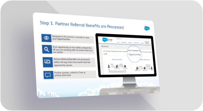 Step 1. Partner Referral Benefits are Processed Navigate to the business console to view your opportunities If an opportunity is not visible contact the AE you are working with to ensure that you are added Partner Referral Benefits are processed within 45 days from the month that the opportunity closed. Further queries, submit a Case at p.force.com/case