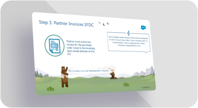 Step 3. Partner Invoices SFDC The Company Name on your invoice must correspond to name on purchase order. If your company name or banking details have changed please contact Partner must submit an [email protected] Invoice for the purchase order value to the invoicing team email address on the PO O is issued within 60 P er qualified ft s a y da PO number must be referenced on invoice e t ase close da ch pur