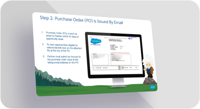 Step 2. Purchase Order (PO) is Issued By Email 1. Purchase Order (PO) is sent via email to Partner within 45 days of opportunity close 2. To view opportunities eligible for referral benefit click on the attached file at the top of the PO 3. Partner must submit an Invoice for the purchase order value to the billing email address on the PO