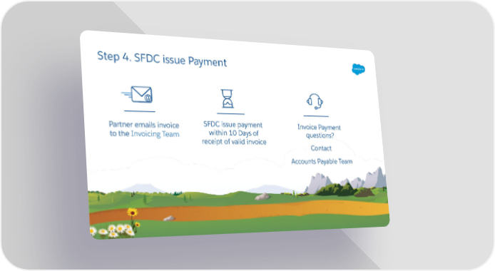 Step 4. SFDC issue Payment @ SFDC issue payment Invoice Payment Partner emails invoice within 10 Days of questions? to the Invoicing Team receipt of valid invoice Contact Accounts Payable Team