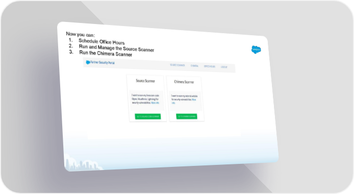 Partner Security Portal Page 5 Now you can: 1. Schedule Office Hours 2. Run and Manage the Source Scanner 3. Run the Chimera Scanner